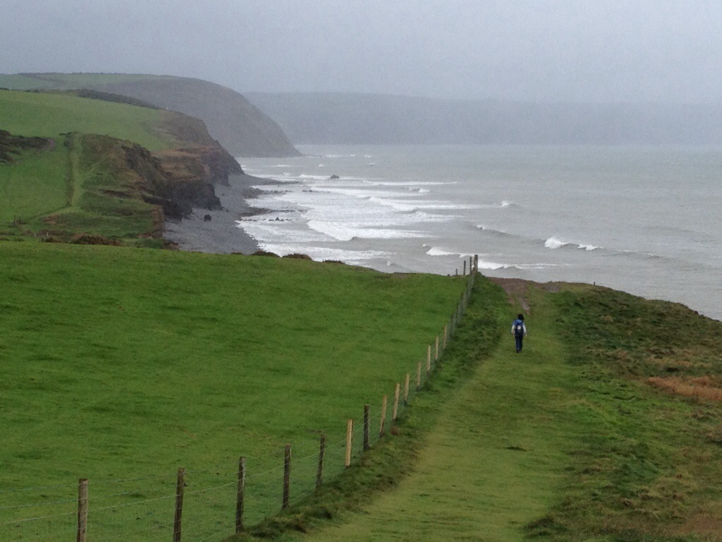 Having delayed our plans for a day already, we were keen to walk the SW Coast Path from Westward Ho! to Clovelly, even though it was raining. We knew we would get wet and bedraggled and possibly miserable; but it wasn’t too cold (~16 deg C) and we were feeling energetic and adventurous. Also, I figured it would be good research for us, both fantasy writers, to experience the whole ‘trek in the rain’ thing.