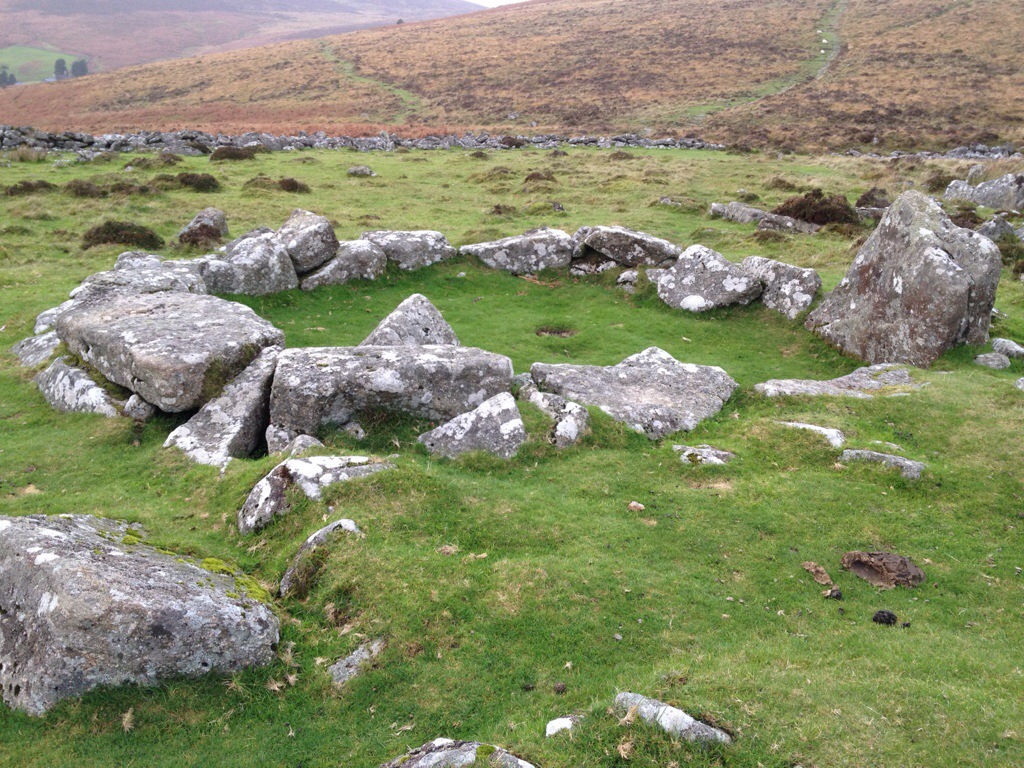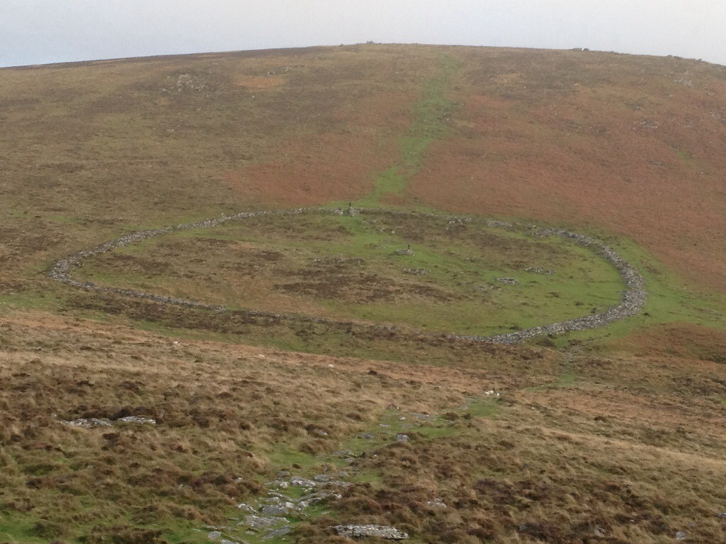 There are the remains of 24 circular huts and signs of animal pens. The compound is fully enclosed by a stone wall. This is what looks like from near the top of Hookney Tor, which had a clear path to the top from beside Grimspound.