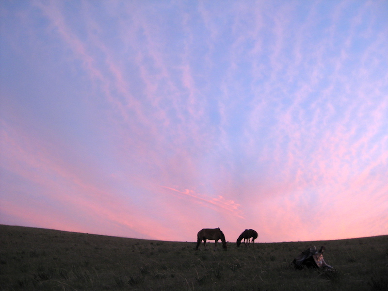 As a side note, the steppes are littered with rubbish (broken glass, plastic bags) and bones. We’ve seen many horse skulls and the skulls of other animals, plus severed limbs and heads. In fact, there’s a dead foal on the hillside not too far from our camp. That’s the natural cycle of life, I guess.