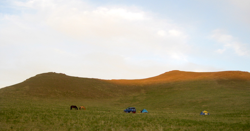 First up this morning was the dawn. We were both woken by the call of some sort of magpie (we think). Unlike Australian magpies, which have a beautiful call, this did not. Anyway, the light outside looked reddish, and I had the sudden urge to see dawn breaking over the steppes. Unzipping our tent, I found we were perfectly oriented to witness a magnificent dawn display — all pink and gold. We watched it for about 15 minutes, took photos and thanked the magpie (which we dubbed the “tourist bird”, assigned to wake campers to see beautiful dawns). I slept some more after that and I think we woke quite late.