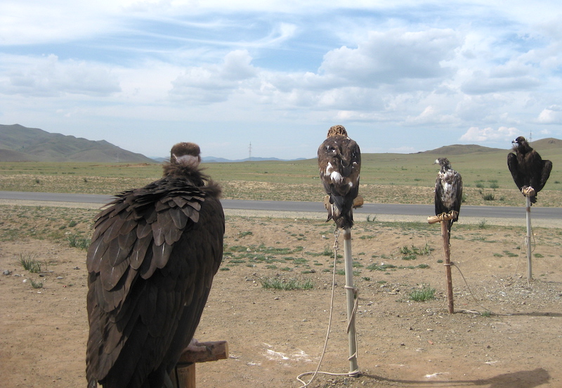 There were a golden eagle (Mongolian hunting bird, approx 8kg), a white-tailed eagle (Mongolian fishing bird, 7kg) and two black vultures (Mongolia’s largest bird, 15 and 20kg respectively). For a modest fee, we could hold the golden eagle — the most beautiful bird, soft feathers. Amazing. (Yes, it was all a bit tacky, and I wasn’t comfortable seeing these glorious raptors tethered on posts at the side of a main road; but how else to get that close?)