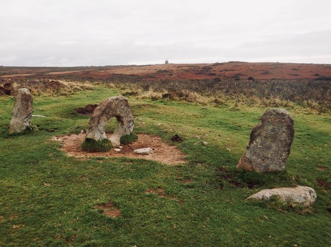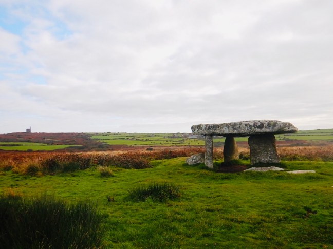 The car took me to Lanyon Quoit, where I clambered over a stile into a field. And immediately my shoes and feet were wet. Not good. The quoit was cool, though. Dated to neolithic times, Lanyon Quoit is one of the best known monuments in the area.