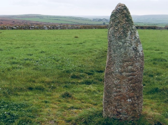 The Men Scryfa (written) stone stands alone in a field, accessed by a stile. There was more damp grass to traverse (my feet were pretty wet and cold). The stone has writing on it (dated 6th to 8th C AD): RIALOBRANI CUNOVALI FILI (of the Royal Raven, son of the Glorious Prince). It is thought to commemorate the death of a Celtic royal soldier.