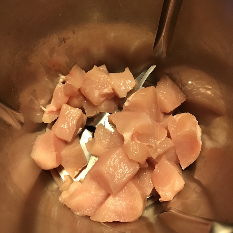 I had never had cause to mince chicken (or in fact any type of meat). You’re limited to 500g, but one chicken breast is a perfect amount. Basically you partially freeze the breast, chop into smallish chunks, then chop it up in about 5 seconds.
